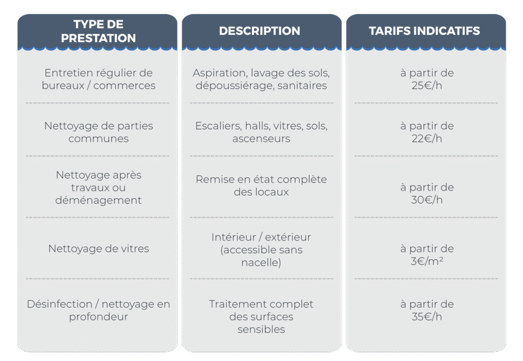Les tarifs dépendent de la surface, de la fréquence, du niveau d’exigence, des équipements nécessaires et du type de prestation. Un devis détaillé est fourni gratuitement après une visite ou une description précise du besoin.